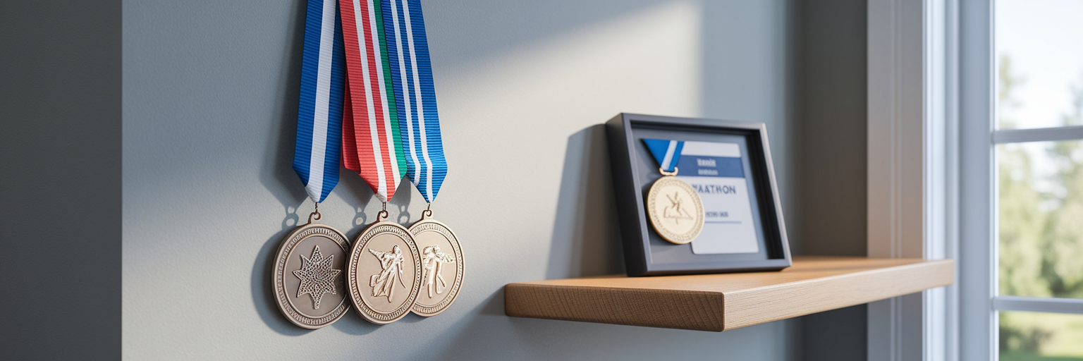 - Cork Board: A simple cork board allows you to pin medals alongside race bibs, photos, and notes. As noted by decor experts at The Monterey Company, this is a flexible and budget-friendly way to create a changing display.